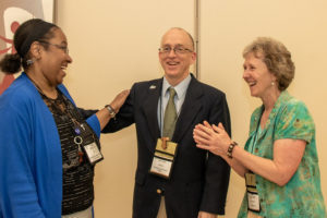 2019 OFS-USA Justice, Peace, and Integrity of Creation Award winner, Kent Ferris, OFS, (center), is congratulated by the JPIC Commission Chair Carolyn Townes, OFS, (left) and National Minister Jan Parker, OFS, (right).