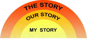 Years ago, at a workshop on Christian initiation, I was introduced to a rainbow shaped diagram like the one pictured below. At the bottom were the words “My Story.” On the half circle band above it were the words, “Our Story”; and at the top, in an overarching band, were the words “The Story”. Kathy, our facilitator, explained the diagram this way: “We each have our own unique story – let’s call it My Story. My Story, as important as it is, is part of something bigger. Let’s call this Our Story. Our Story is the story we share with our families and friends in our homes and workplaces. It’s the story of our faith community and the wider Church, and it is even more. Our Story is the story of all people, the story of our world and all creation. But above all that, there is something even greater. Let’s call it The Story. What is The Story? It’s a story written by and known only to God.” This simple diagram gave me a way to see how it all fits together.