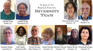 St. Joan of Arc Region’s Diversity team participants are from Texas, Louisiana, and Mississippi and from various ethnic backgrounds including Asian, African, Filipino, Cuban, and European. As we come together as representatives from throughout the Region, we reflect the diversity of our Order. We will continue to work toward ways of strengthening the call of our Franciscan vocation by “seeking out ways of unity and fraternal dialogue.”