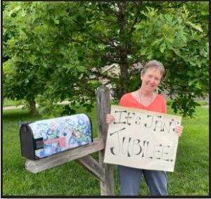 I will never forget my 50th birthday. My daughter, aware of the significance of this 50-year mark, made a sign that she hung on my mailbox. It simply said, “It’s Jan’s Jubilee!” I still have that sign. It now hangs on a wall in my garage as an important reminder to always turn to God, where I find joy and peace beyond all I could ask or imagine.