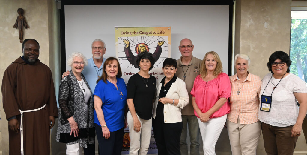 From left to right, CIOFS general spiritual assistant to the OFS Fr. Tomas Ginga Panzo Suva, OFM Cap.; secretary Susan Ronan, OFS; councilor Chris Leone, OFS; international councilor Mary Frances Charsky, OFS; minister Jane DeRose-Bamman, OFS; vice minister Diane Menditto, OFS; treasurer Steve Roszhart, OFS; councilor Christine Blood, OFS; councilor Corinne Lorenzet, OFS; and CIOFS election presider Ana Maria Raffo Laos, OFS.